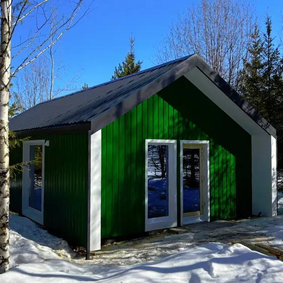 Ваш будущий дом может выглядеть именно так — эффектный и современный барнхаус с оригинальным фасадом, обшитым металлическим сайдингом «Евро-Брус» в насыщенном оттенке RAL 6002 Зеленый лист. Яркий зеленый цвет сразу привлекает внимание, подчёркивает стиль и индивидуальность постройки, а надежное полимерное покрытие гарантирует долговечность и защиту от любых капризов погоды. Такой фасад — это не просто внешняя отделка, это визитная карточка дома, которая каждый день будет радовать вас и впечатлять гостей.